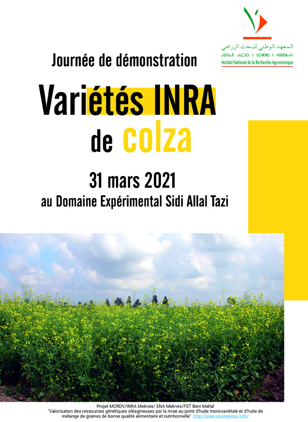 L’Institut National de la Recherche Agronomique (INRA) organise une journée de démonstration des variétés INRA de colza, le 31 mars 2021 à 10h00 au Domaine Expérimental Sidi Allal Tazi (Commune Sidi El Kamel – Province de Sidi Kacem).