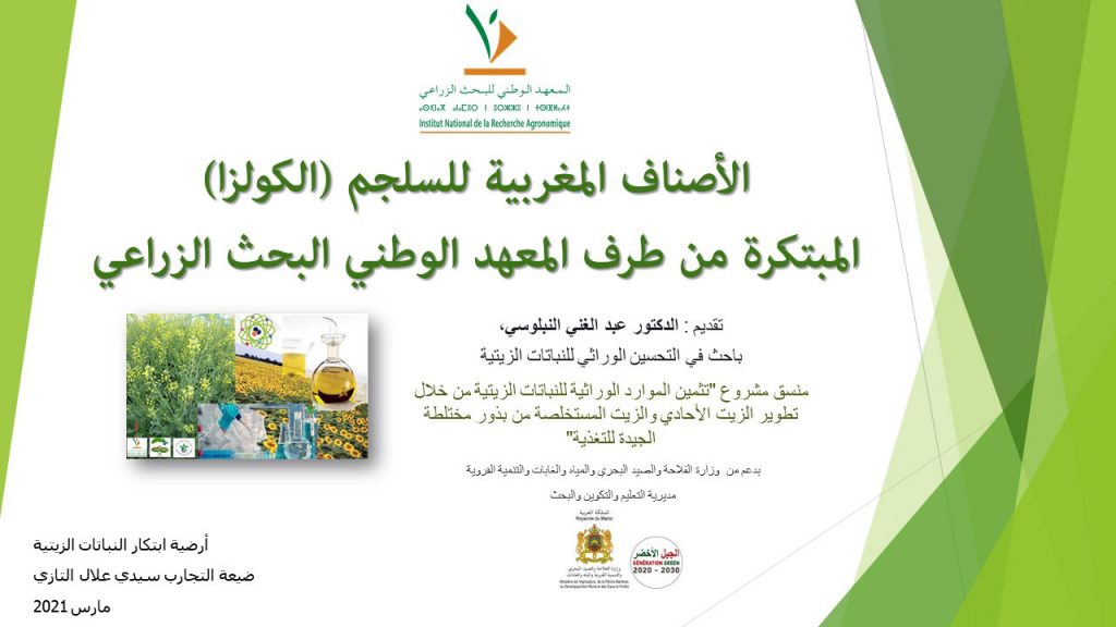 Il s’agit de la présentation d’une plateforme d’innovation à base de nouvelles variétés de colza récemment obtenues, en plus des six variétés marocaines déjà inscrites au Catalogue Officiel entre 2008 et 2018. Toutes ces variétés sont hautement productives en graines et de type Canola ; avec une huile de bonne qualité indemne d’acide érucique et un tourteau à faible teneur en glucosinolates.